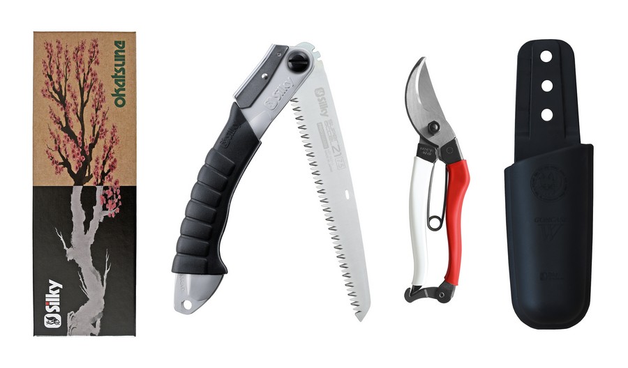Extra groot rubberen holster om de Okatsune snoeischaar samen met een Silky vouwzaag in op te bergen.