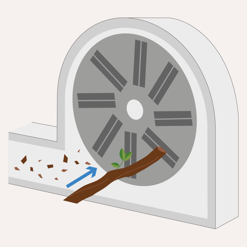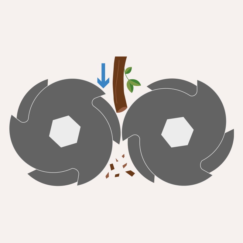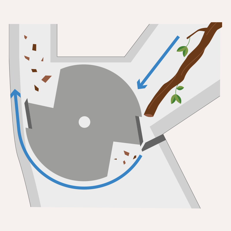 De geometrie van het gehele systeem zorgt ervoor dat de houtvezels van de takken dwars worden afgesneden. Met een specifieke slijping van de messen is er weinig weerstand tijdens het snijden en ontstaan er fijne, gelijkmatige houtsnippers die snel composteren. Door de rotatiekracht van de rotor worden de snippers bovendien direct naar buiten geslingerd, zonder dat daar een apart systeem voor nodig is.
