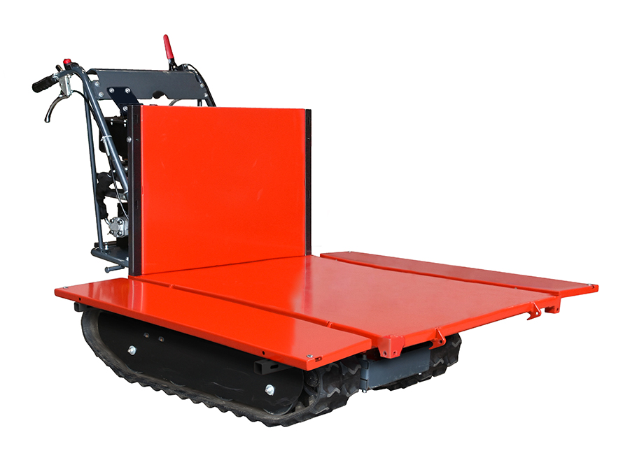 Deze dumper met platte bak heeft een hydraulisch kiepsysteem