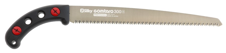 KSI310230 - De Gomtaro, basisserie van de Silky snoeizagen met recht zaagblad, wordt wereldwijd door professionals gezien als onmisbaar onderdeel van de basisuitrusting. Het geavanceerde ontwerp van de Mirai-Me vertanding, de tanden zijn in de bladdikte ingeslepen, er is geen tandzetting, zorgt ervoor dat u moeiteloos door het hout zaagt met een zeer gladde afwerking van de zaagwond tot gevolg. Het uit een speciale staallegering gemaakte blad bestaat uit één geheel en loopt door in het handvat wat ervoor zorgt dat de Gomtaro lang scherp blijft en een perfect balans heeft. Het blad is voorzien van een nikkel laag dat beschermt tegen roest en zorgt voor een zeer slijtvast oppervlak. Het uit rubber gegoten handvat ligt comfortabel in de hand en reduceert trillingen sterk. De zaag past precies in het op maat gemaakte, zwarte kunststof foedraal met afneembare riemhouder. Het foedraal, dat aan het been (er zijn speciale Silky leg straps verkrijgbaar) of de riem kan worden bevestigd, heeft onderaan een opening, waardoor vocht en zaagsel uit de holster kunnen wegvloeien.De Gomtaro is verkrijgbaar in zes lengten: 180 - 210 - 240 - 270 - 300 en 330 mm en 2 vertandingen. De grove vertanding (8 tanden per 30 mm) is geschikt voor het snoeien van vers hout. De fijne vertanding (13 tanden per 30 mm) is ideaal voor het zagen in meer droge en hardere houtsoorten, zoals die van fruitbomen. - Bladlengte: 300 mm- Vertanding: 8 per 30 mm